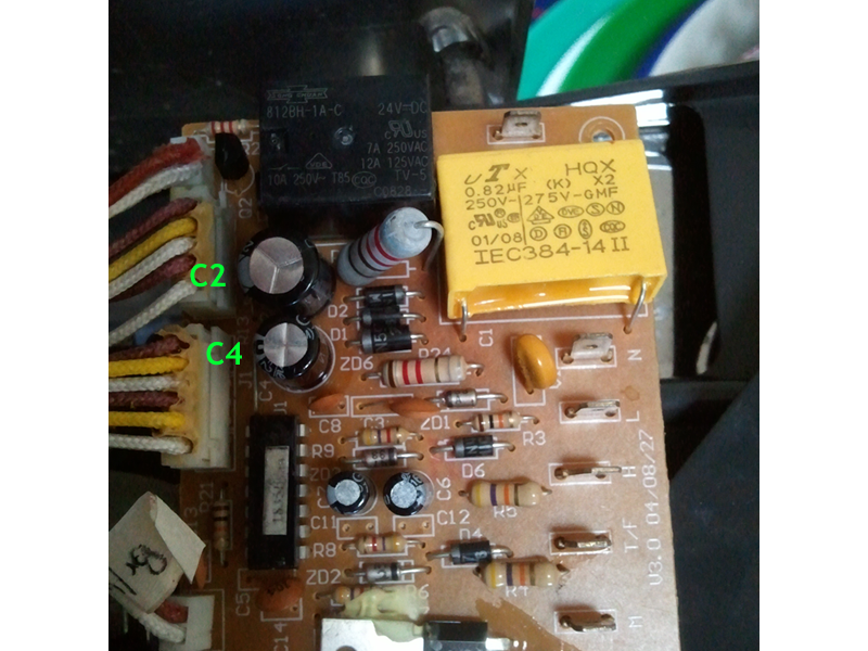 Our 800ESXL had/has some of this glue, and it started to become conductive, partially connecting the non-powerline end of C1 to the anodes of D1 and D6 (circuit common, e.g. line hot), and the cathode of D2 (V++). Now, in this particular case, the conductive glue probably did not and might not ever have made a difference, since this is a high-current low-impedance area of circuitry: not that sensitive. If conductive glue were connecting more sensitive areas of circuitry, such as any pins of the microprocessor IC or the switches connected to it, things could be more exciting. The Breville engineers seem to have done a good job keeping this adhesive away from sensitive areas. Yet, given what i have seen, as soon as i saw it (and well before i had drawn out the schematic to see that it was in a low-sensitivity part of the circuit), i removed it, and i recommend anyone already working on their circuit boards do the same. Probably not worth a special trip into a working unit, yet if there is any other reason to be in there, take it off and make it a non-issue. Only the brown, crusty parts need to be removed (mechanically, followed by your favorite solvent)… the light tan/gold soft, springy parts may remain, which is good because they often are still happily acting as a strong adhesive and do not willingly come off.