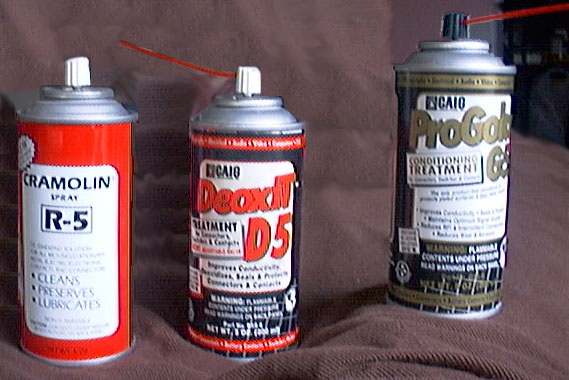 Also in the 1990s (i believe), Caig introduced a new contact cleaner, ProGold® (can on the right in the picture). This new, more expensive cleaner was (and is) primarily intended for gold and gold-plated contacts, though Caig claims it may also be used with non-gold contacts, as for DeoxIT/Cramolin, with excellent results.
